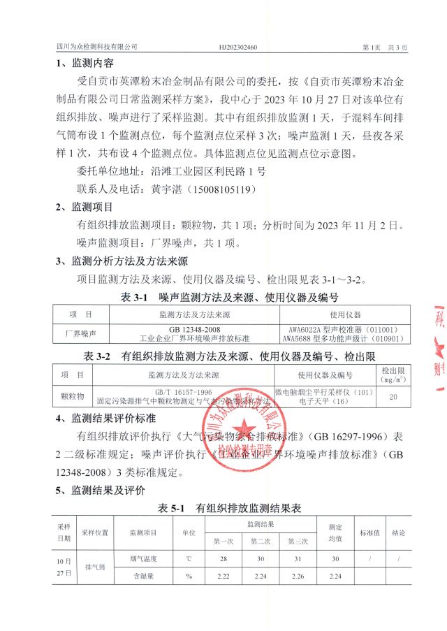 自贡市英潭粉末冶金制品有限公司2023年监测报告
