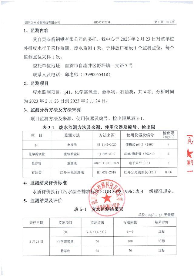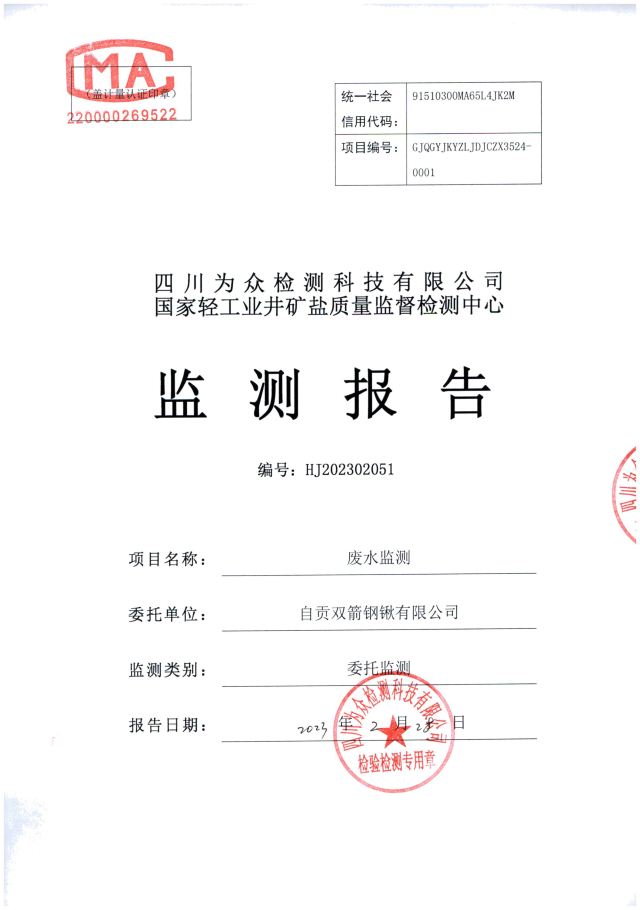 自贡双箭锹有限公司2023年废水检测报告